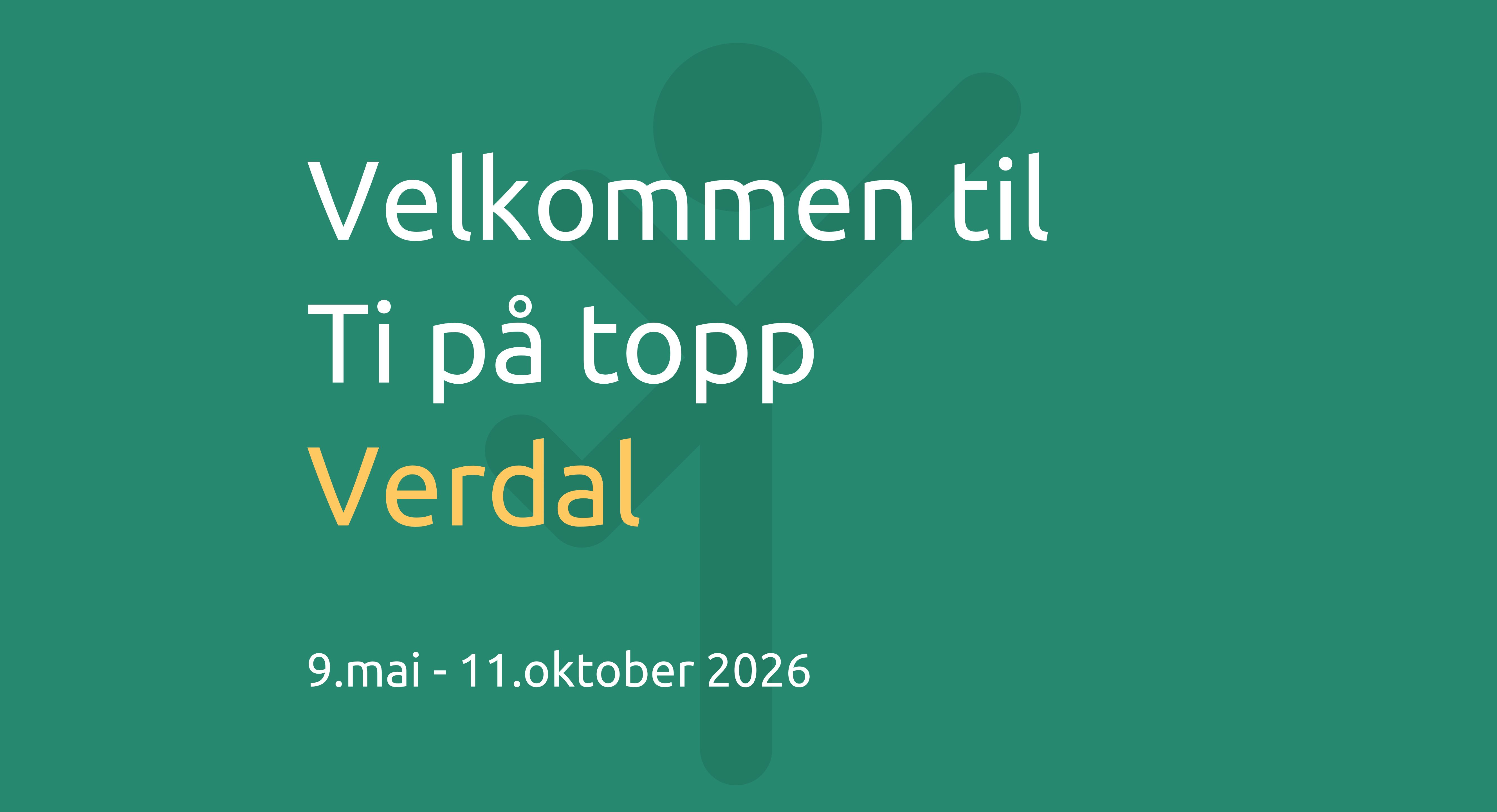 Ti på topp er et godt tilrettelagt turtilbud hvor du, familie, venner eller kolleger kan få påfyll og oppleve noe av det beste naturen i Verdal har å by på. Vi har turer for alle, uansett fysisk form. Både lavterskel og for fjellgeita. I appen Ti på topp ligger turbeskrivelser, løypekart og bilder. Konkurranseelementet er litt hva du gjør det til selv, gå én, noen eller alle turene flere ganger. Registrer turene eller bare nyt. Last ned appen Ti på topp og kom i gang.